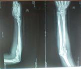 手法正骨前 余**,女,55岁, 患者不慎摔倒损伤右手,后经拍片示:右桡骨粉碎性骨折伴右桡尺关节半脱位,医院建议手术治疗,患者不想手术,想中医保守冶疗,后经朋友介绍来诊,经本门诊特色手法整骨及夹板固定,再次拍片示,骨折对位对线良好已达98%以上。 手法正骨后[详情]